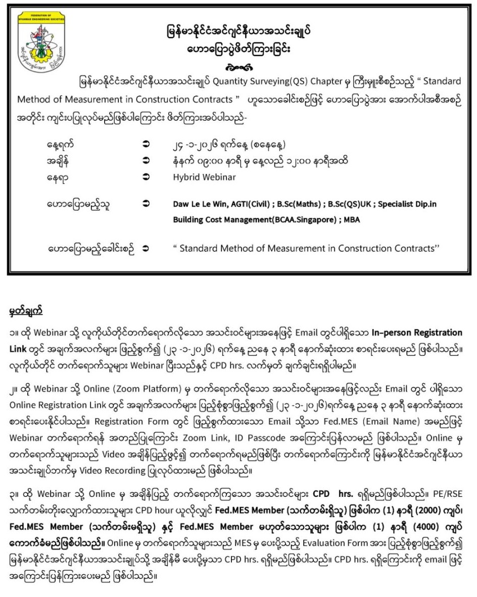 ***Remark: ‼️၂၄-၁-၂၀၂၆ ရက်တွင် နံနက် ၉ နာရီ မှ နေ့လည် ၁၂ နာရီအထိ ပြုလုပ်မည့် Webinar နှင့် နေ့လည် ၁ နာရီ မှ ၄ နာရီအထိပြုလုပ်မည့် Webinar (၂)နှစ်ခုစလုံးအတွက် Registration Link, ID & Passcode ကို တစ်ခုတည်းသာ အသုံးပြုသွားမည်ဖြစ်ပါသဖြင့် Registration Link, ID & Passcode သည် Webinar (၂)ခုစလုံးသို့ တက်ရောက်လို့ရရှိမည် ဖြစ်ပါသည်‼️
