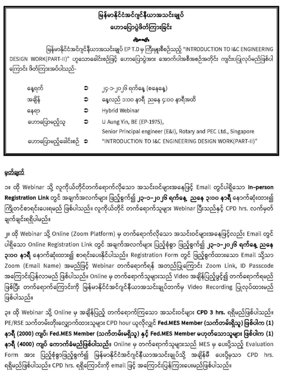 ***Remark: ‼️၂၄-၁-၂၀၂၆ ရက်တွင် နံနက် ၉ နာရီ မှ နေ့လည် ၁၂ နာရီအထိ ပြုလုပ်မည့် Webinar နှင့် နေ့လည် ၁ နာရီ မှ ၄ နာရီအထိပြုလုပ်မည့် Webinar (၂)နှစ်ခုစလုံးအတွက် Registration Link, ID & Passcode ကို တစ်ခုတည်းသာ အသုံးပြုသွားမည်ဖြစ်ပါသဖြင့် Registration Link, ID & Passcode သည် Webinar (၂)ခုစလုံးသို့ တက်ရောက်လို့ရရှိမည် ဖြစ်ပါသည်‼️