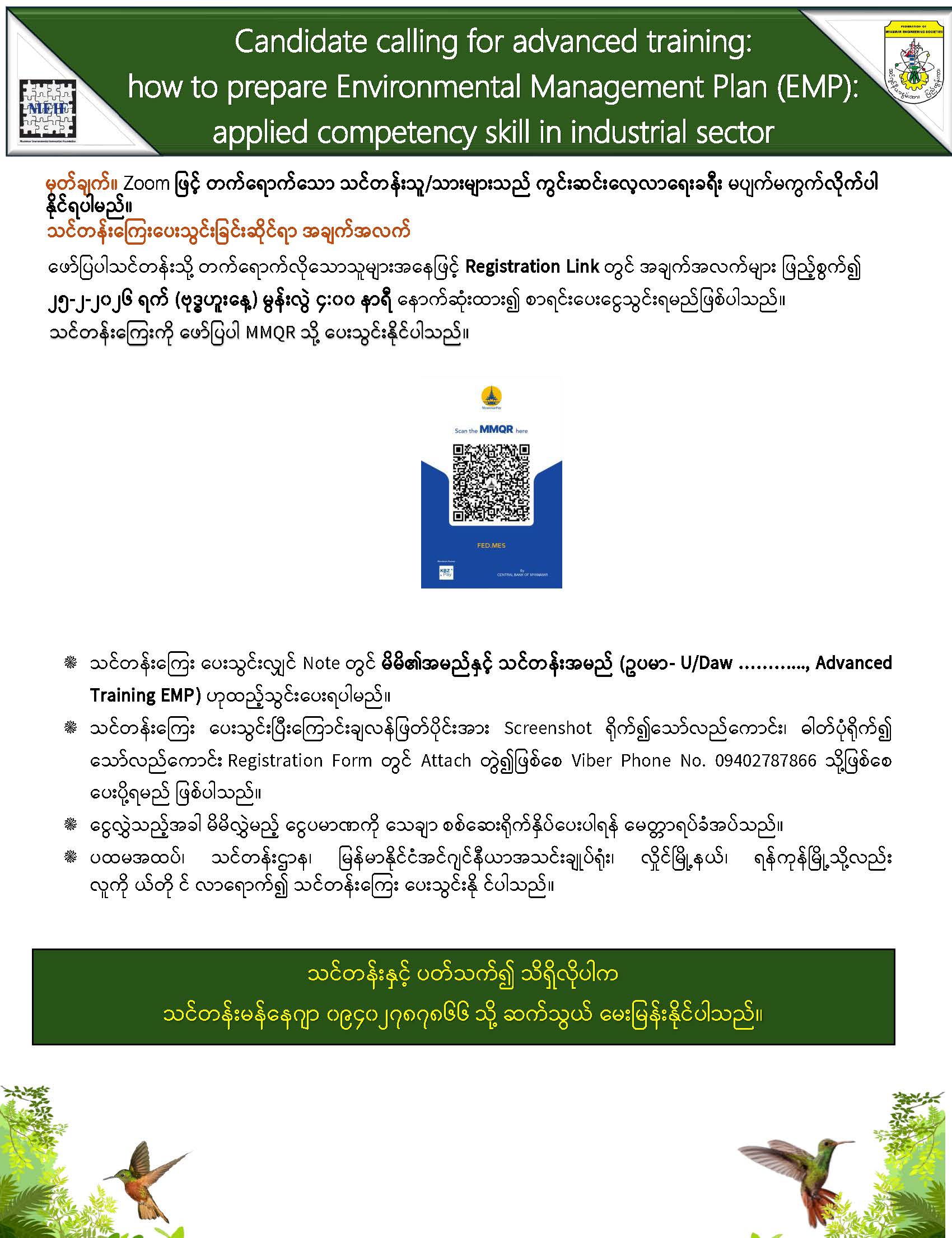 Candidate calling for advanced training: how to prepare Environmental Management Plan (EMP): သင်တန်းဖွင့်လှစ်မည်